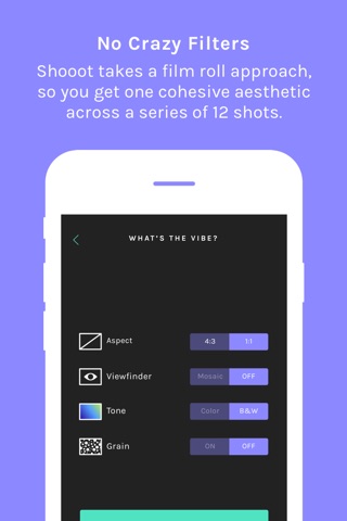 No crazy filters. Shooot uses a streamlined film roll approach, giving you a cohesive aesthetic across a series of 12 shots – perfect for parties or hikes or quick trips. For each shoot, you’ll be able to choose color or black&white, grain or no grain options, and square or 3:2 dimensions.