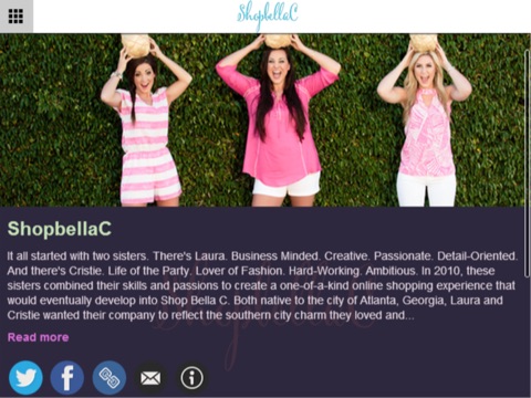 It all started with two sisters. Theres Laura. Business Minded. Creative. Passionate. Detail-Oriented. And theres Cristie. Life of the Party. Lover of Fashion. Hard-Working. Ambitious. In 2010, these sisters combined their skills and passions to create a one-of-a-kind online shopping experience that would eventually develop into Shop Bella C. Both native to the city of Atlanta, Georgia, Laura and Cristie wanted their company to reflect the southern city charm they loved and missed since they made their big move to the Natural State with also bringing in pricepoints that everyone can enjoy.