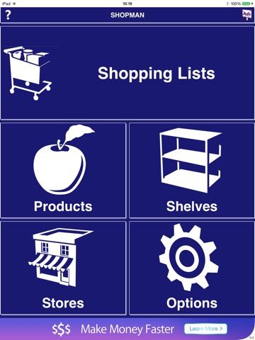 Shopping List Manager (Shopman) is a simple yet comprehensive app to allow you to quickly and easily keep your shopping lists on your iPhone or iPad. Special thought has been given to its use on an iPhone as it is these devices that you carry around with you in supermarkets. Shopman shopping list manager is broken down into five separate areas. Three of these are for the definition of stores, shelves and products. Then there is an options area and finally, once everything is defined, you can create your individual shopping lists. There is one shopping list per store and as stores are unlimited, you can have as many shopping lists as you wish. Stores can be anything you like such as "Sainsburys" or "Sainsburys Weekly", "Sainsburys Monthly", etc. if you prefer.