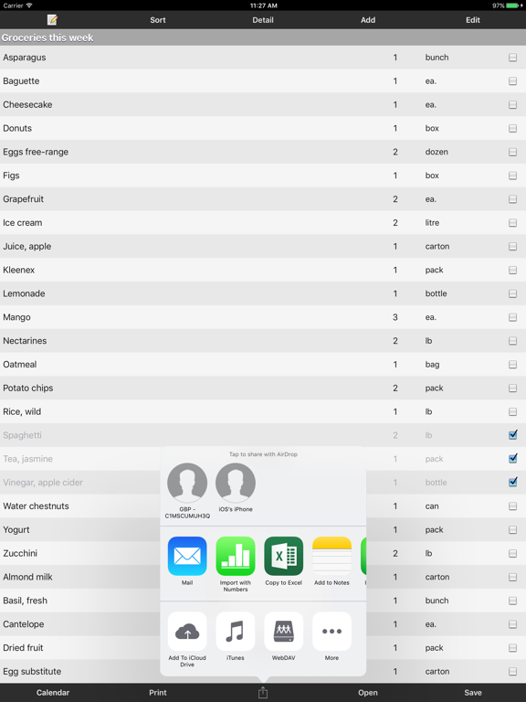 ~ Share shopping list as image, pdf file or csv file to Pages, Microsoft Excel, E-mail, Messages, Notes and etc.