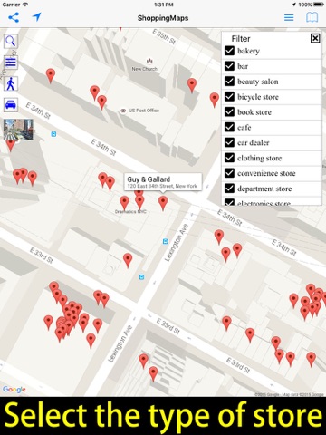 Markers display the location of stores within the area of the map being viewed.