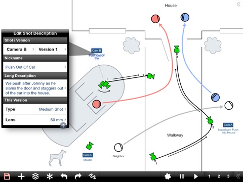 The Free Version of Shot Designer is full-featured except for Save, Export and Sync/Team. Your current scene is always saved, and you can be fully productive working on one scene at a time. The Pro Version (in-app upgrade) adds File Management, identical Mac/PC Desktop Version, Sync and Team Sharing, PDF/JPG/Excel Export and more.