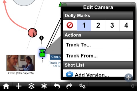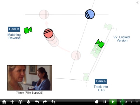 Shot Designer is FAST. The app knows how Directing works and automatically does most of the work for you. Cameras rearrange themselves when you move characters. Animate characters and cameras with simple Walk To and Track To commands. Create sophisticated tracking shots with multiple marks. Shot Designer is fast enough that you can rearrange the diagram with actors waiting.