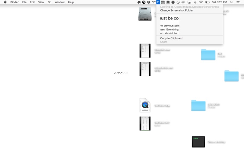 Shotglass is the easiest way to automatically grab and share screenshots! Shotglass sits in your menu bar and finds your latest screenshot, letting you get to it quickly, open it in Preview, copy it to your clipboard, or share it online.
