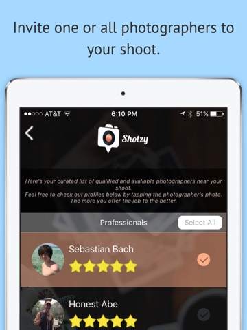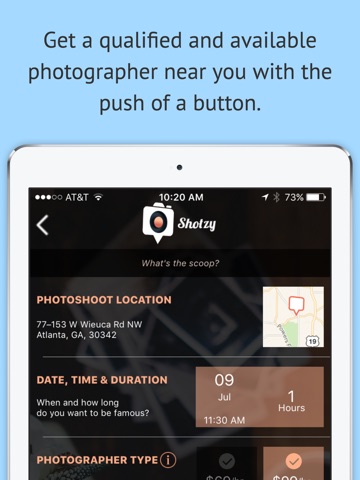 Just tell Shotzy when, where, and for how long. With just those few taps Shotzy returns a curated list of passionate photographers nearby and available for your shoot. Invite all photographers or choose who you like by reviewing a sample portfolio and bio of each one on your list. Tap submit and your chosen photographers phones wake up and let them know about your request. The first photographer to accept gets the job. On the day and time of your shoot use Shotzys live tracking feature to easily connect with your photographer.