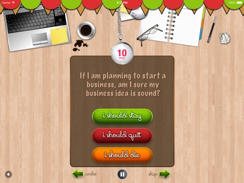User will be given 15 sec for every answer. After every answer user will be informed whether he falls in Green Zone (STAY) or Red Zone (QUIT). After the allocated time, the unanswered situations will be skipped.