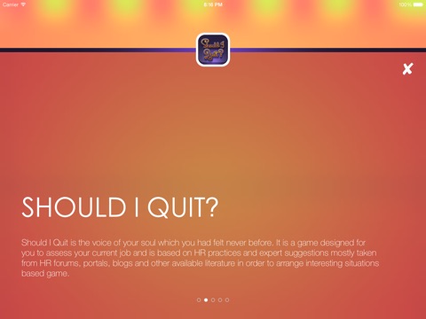 Should I Quit is a game based on HR practices and expert suggestions mostly taken from HR forums, portals, blogs and other available literature in order to arrange an interesting situations based game. The situations are the result of hundreds of case studies, interviews and interactions with clients, readers and living legends around the world. I hope they shed some light on how you plan to put your dent in the world. Professionals who want to get an idea about their current job, will be able to get a clear advice from the game that they should stay with their current job or they should quit. .