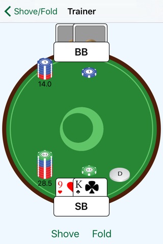 Learn how to play headsup shove or fold No Limit Holdem Poker optimally. Quickly look up which hands are worth playing or take a training session to test your knowledge by playing against an optimal opponent.