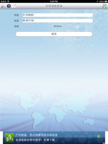 - Two query mode: Just tap in the map,the altitude will be shown immediately. Or you can input the latitude and longitude to query the altitude.