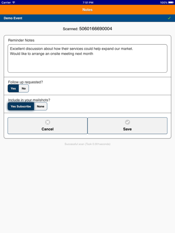 In "exhibitor mode", the app owner scans an attendee badge and the scanner groups details are automatically emailed to the attendee by ShowBadger systems. The person scanning will not see the attendees email address at this point.