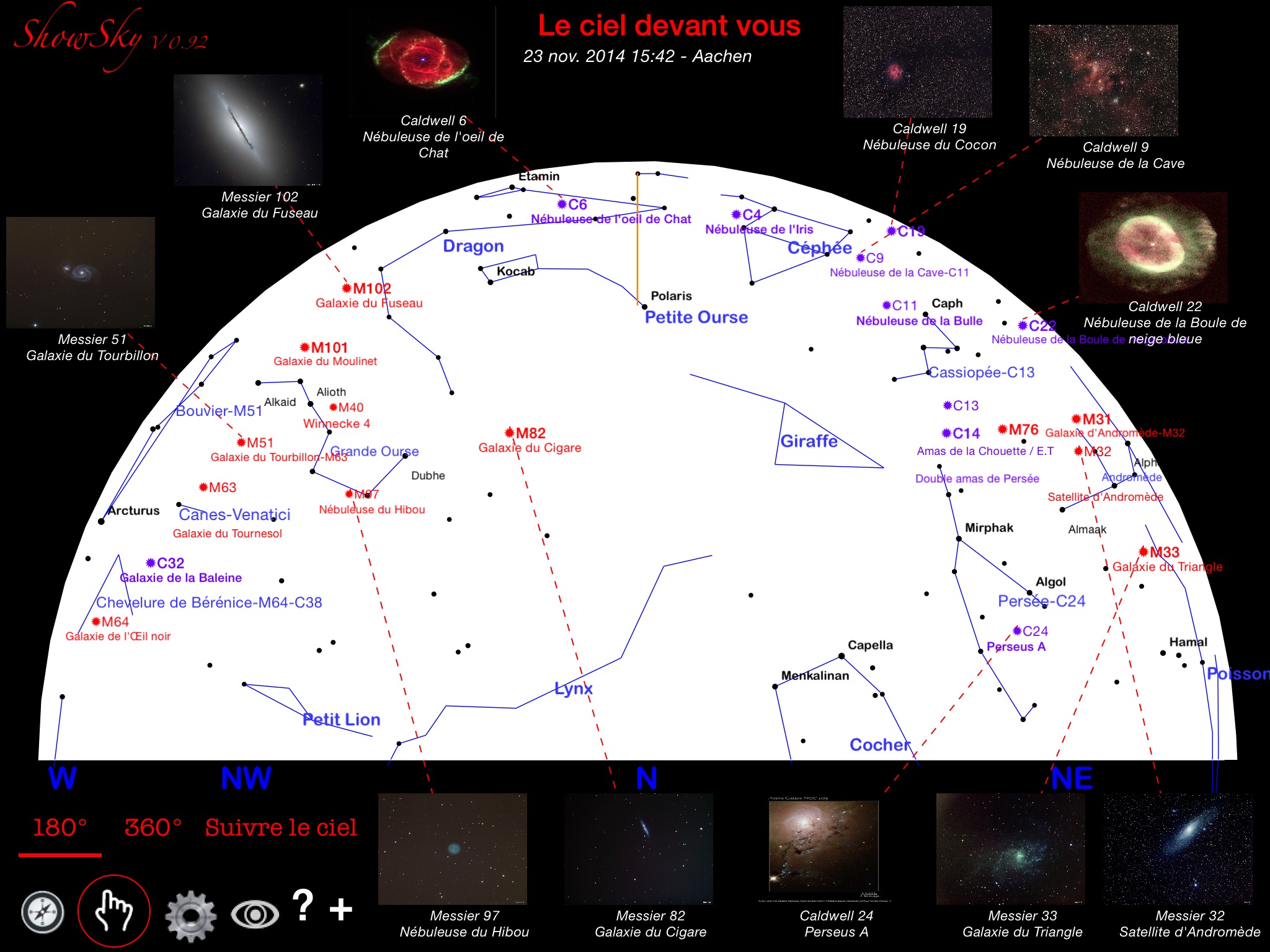 The 180 deg map shows you the whole sky in front of you with a flat horizon just as you see it. The 360 deg map shows you the whole visible sky at this moment and the "track" view allows you to point your device towards the sky and see in details what is there. Just turn around to see all currently visible constellation and objects.