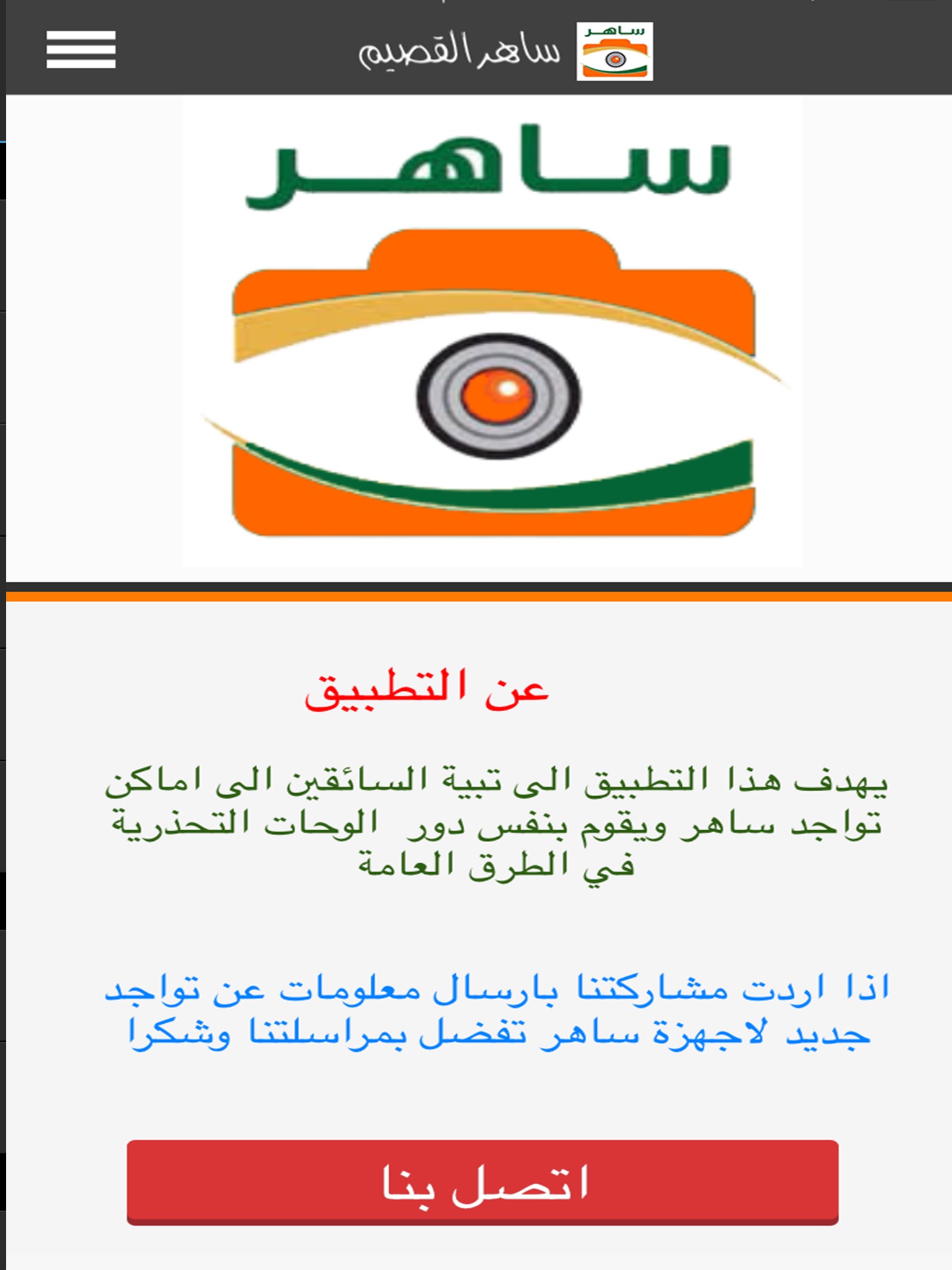 يهدف هذا التطبيق الى اعلام قائدي السيارات عن مكان تواجد ساهر سوا كان جهاز ساهر عند اشارة مرور او كبينة ثابتة اوسيارة متحركة مع امكانية عرضها في الخريطة دخل مدينة بريدة والمحافظات التابعة لها مثل محافظة عنيزة و المذنب والبكيرية والرس والمذنب وعيون الجواء والاسياح ورياض الخبراء وغيرها.