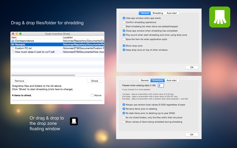 Securely erase files, meaning that if they are ever recovered (by specialist software) their content will be useless. For added security, data can be overwritten up to 35 times and the name and date of the file/folder changed to random values.