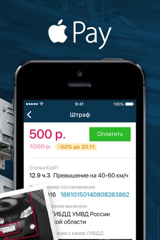 Проверка и оплата штрафов по официальной базе ГИБДД России и базе Федерального казначейства ГИС ГМП • Фотографии нарушения с камер ГИБДД • Безопасная оплата банковской картой • Оплата через Apple Pay • Touch ID • Квитанция об оплате штрафа • Техническая поддержка по всем вопросам оплаты штрафов • Действует 50%-скидка на оплату штрафа в первые 20 дней • ПДД 2018