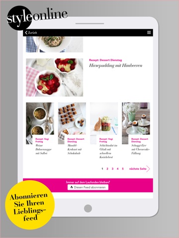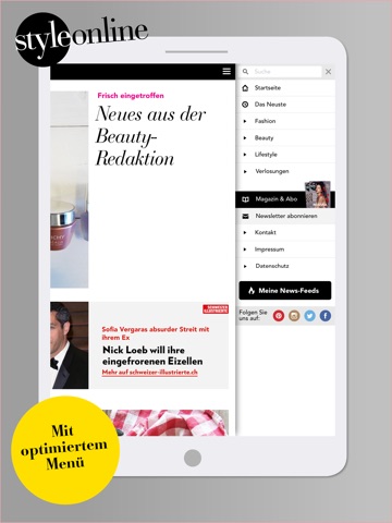 News-Feeds: Abonnieren Sie Ihre Lieblings-Themen auf Style und verpassen Sie keine News mehr! So gehts: Am Ende einer Themen-Seite finden Sie einen Button zum Abonnieren des Feeds. Sie erhalten dann eine Nachricht, sobald ein neuer Artikel aufgeschaltet wird. Im App-Menü unter «Push-Einstellungen» lassen sich die abonnierten Feeds verwalten. Damit es funktioniert, müssen Sie der App erlauben, Ihnen Mitteilungen zu senden: Unter «Einstellungen» => «Mitteilungen» => «Style» lässt sich die Einstellung ändern.