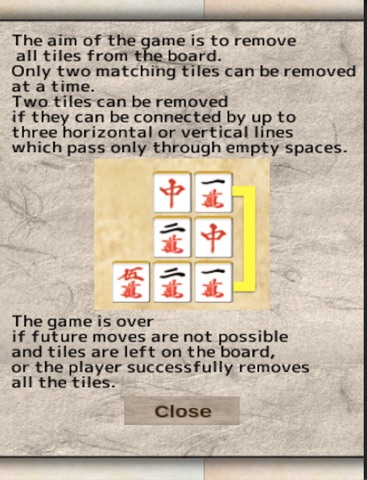 The aim of the game is to remove all tiles from the board. Only two matching tiles can be removed at a time. Two tiles can be removed if they can be connected by up to three horizontal or vertical lines which pass only through empty spaces. The game is over if future moves are not possible and tiles are left on the board, or the player successfully removes all the tiles.
