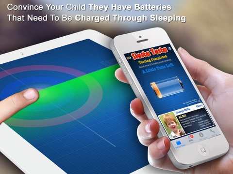 Children are used to smartphones and high tech toys, knowing that none of these work when the battery goes flat. To your child, our app appears to test their current energy levels, which shows as a low battery display when they hold their finger on the screen’s testing circle. Your child sees when their batteries are running low and will be convinced that it is time for their sleep. Plain old fashioned trickery that works!