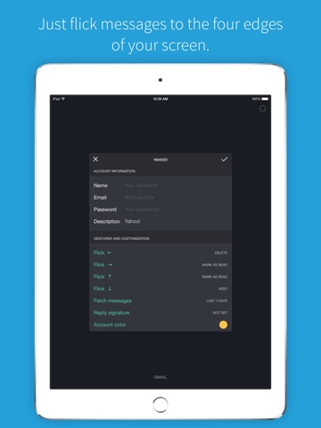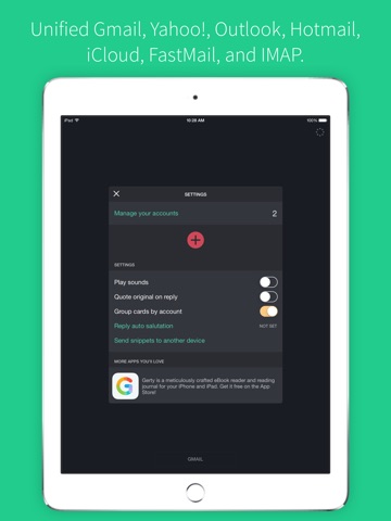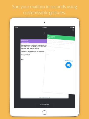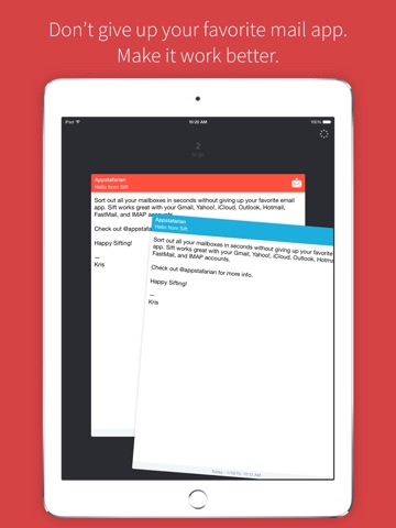 Sift is the perfect companion to your favorite email app. Sort out your mailbox in seconds using simple and customisable gestures. Works great with Gmail, Yahoo!, iCloud, Outlook.com, Hotmail, FastMail, IMAP, and other services.