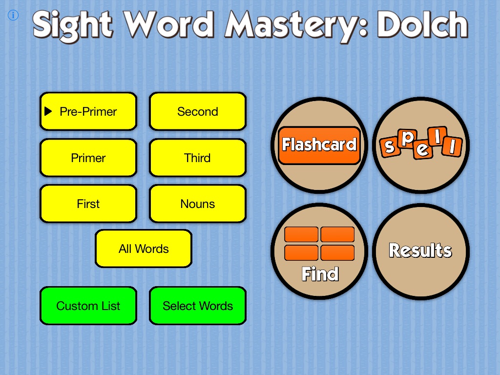 All six Dolch word lists are included in this game: Pre-Primer, Primer, First, Second, Third, Nouns. You have the ability to customize the game and select which sight words you want your student or child to focus on. Additionally, statistics are gathered on every action so you can measure your student or childs progress and know which areas are mastered and which need additional activity.