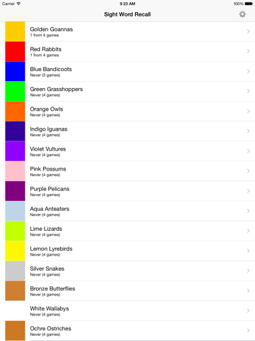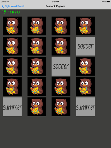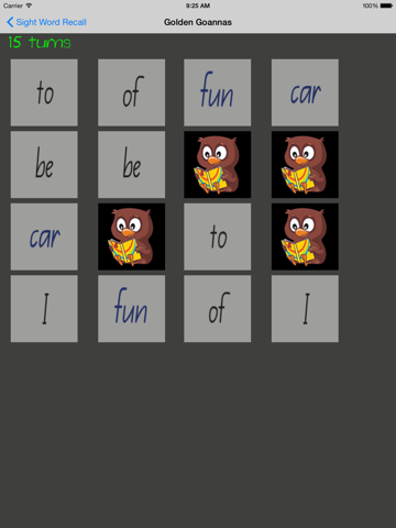 There are only 20 tiles in each game therefore the game includes pairs of only 10 randomly selected words from a chosen word list. The application can speak the word to the child which will help the child map the word and the sound.