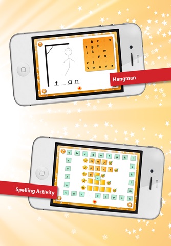 Touch a star to hear a word. Touch a letter in the word that you heard, and drag the letter into one of the blank boxes. Keep dragging letters into the blank boxes until you have spelled the word. Touch the checkmark to hear the correct spelling of the word.