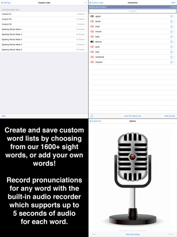 Thank you for another great app.. I have purchased 4 of your apps and love them all.. I would like to see you add pale colours for the background.. I find it much easier on the eyes... Cheers and keep up the great work.... PS... I would love to see you make an app for building sentences using the same sight words... with the added ability to create your own sentences (3 - 6 words), with a recording option... :-) Cheers!!