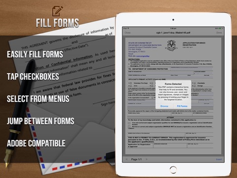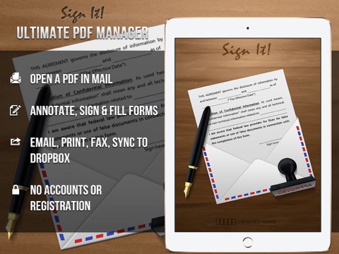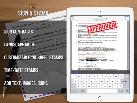 Not bad, but I miss features like widescreen keyboard and more stamps like ticks for boxes to cross, Tick boxes, Lines ... Would Be also Fine to define and draw own stamp templates for future use... I like the feature to send finished documents but Why the Heck do i have to edit them again before I can Mail them again if they are already Stores locally. Please Change that. Its definitive a GUI blooper.