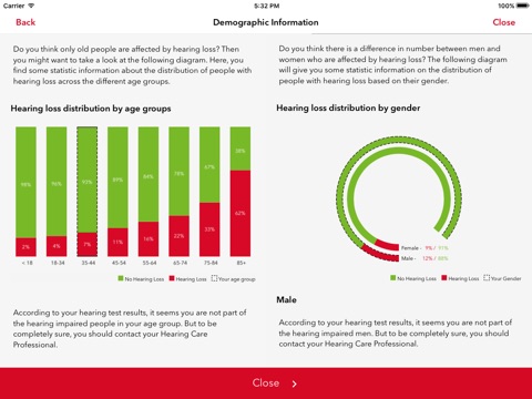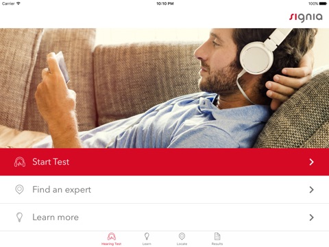 The Hearing Test was created by our audiology experts to help you determine whether you have hearing impairment. This revolutionary application has been scientifically developed and carefully tested to ensure the most precise results possible, with an accuracy rate of 96%. In addition, the test is completely independent of language, so you can use it reliably no matter what language you’re most comfortable with.