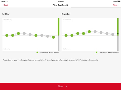The test consists of 9 test items per ear and determines how well you can understand speech in background noise. By comparing your results with the average score for normal listeners, the program might help you determine whether you have hearing impairment. However the results of the Hearing Test are not to be utilized as an official outcome for assessing levels of hearing loss. True hearing loss assessments can only be determined by a licensed hearing care professional.