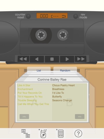 For example, changing rotation speed of reels based on tape amount, animation of wrapping end of the tape to reels, the player with counter and auto reversing, a sound of operation, song list like cassette index cards, lettering album title.
