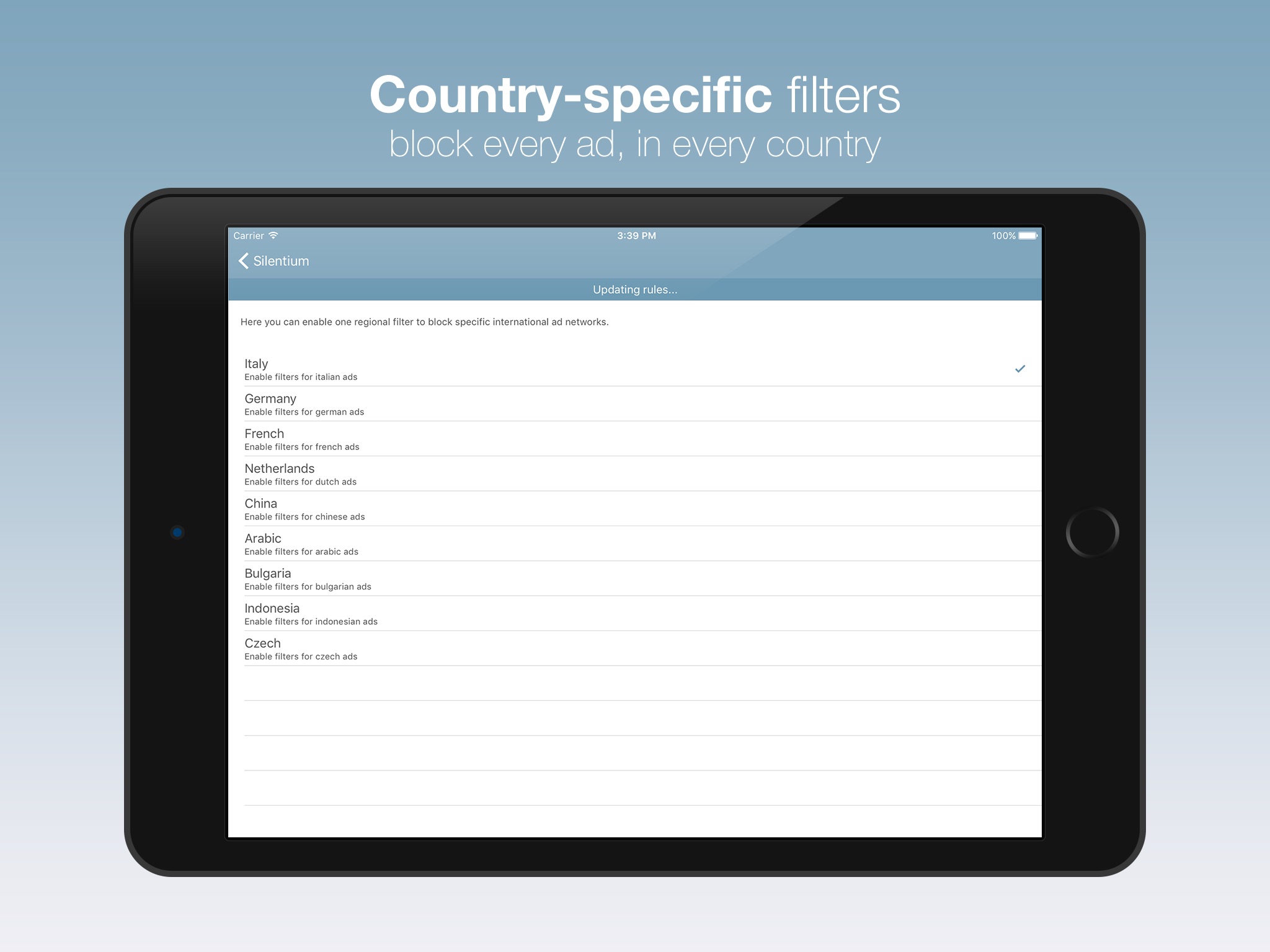 Silentium is no longer actively maintained. We may remotely updates the ad-blocking rules from time to time, but nothing more. Thanks to everyone who bought the app for supporting us.