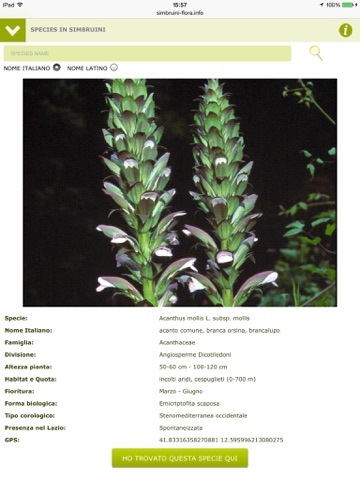 Con questa applicazione oltre a poter consultare le schede delle specie vegetali del Parco dei Monti Simbruini, allinterno del parco potrai geolocazziare la tua posizione e visualizzare la lista di tutte le specie vegetali che si trovano intorno alla tua posizione GPS.