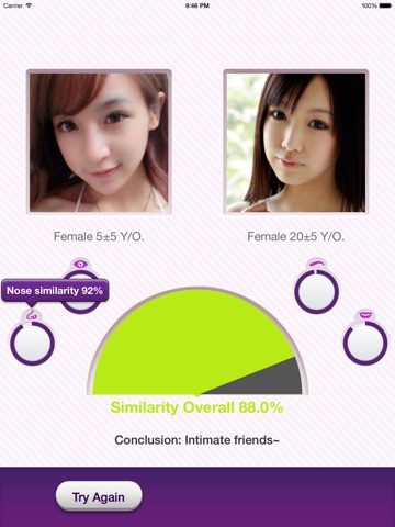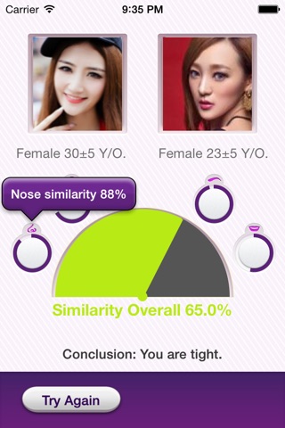 Similar Meter is a software to find how others look like you, and find the relationship between you and him/her. Upload your photo and we will find your eye, mouth, nose, eyebrow, then calculating similarity between you and him/her. Whats more, Similar Meter also exactly know your age, gender and race from your photo. So just try it!