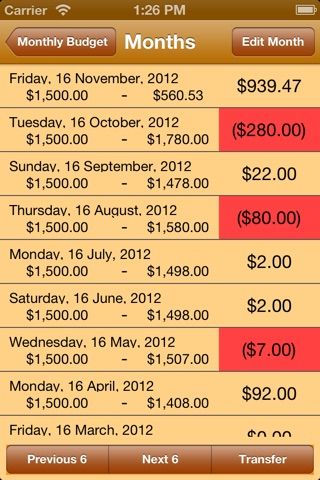 Each Month can have its own budget set for it. You can specify a default budget for the month but then override that amount. So you might set your budget at 2000 pounds/dollars and set the preferences to that value but for Christmas month, holiday and other special months you can set the budget higher. Or you may be paid differing amounts each month. This App lets you set the budget for each month to whatever you want. Just select the budget field on the main page and type in the new budget for that month. Select OK on the keypad and the new budget is shown.
