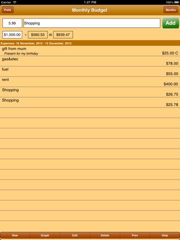 Although the general focus is recording what you are spending this month this App does not restrict you in what you are allowed to do. If you want to add a purchase to a future or previous month then you can. Nor, does it stop you from altering the amount specified if you want to. It is simple to add an expense, edit an expense, change months to record expenses for other months, delete an expense for a month, make notes for each expense.