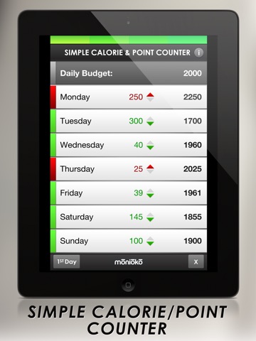 Designed to encourage daily tracking by keeping the user experience simple. Entering calories/points for a specific day is as simple as tapping the day, entering the amount, and selecting to either add or subtract the amount. Use the “add” button when entering food consumed, and the “subtract” button to allow for calories expended while exercising.
