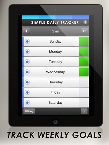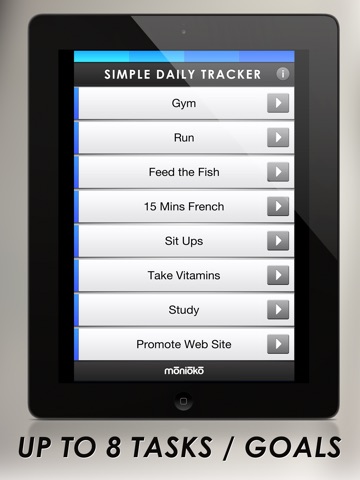 • Simple Daily Tracker can be used in two ways: to track your daily goals such as Sit-ups, and as a reminder of recurring tasks like Feed the Fish.