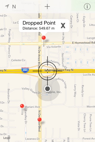 Use Simple Distance Finder to get a simple straight line distance between you and any pin you drop on the map.