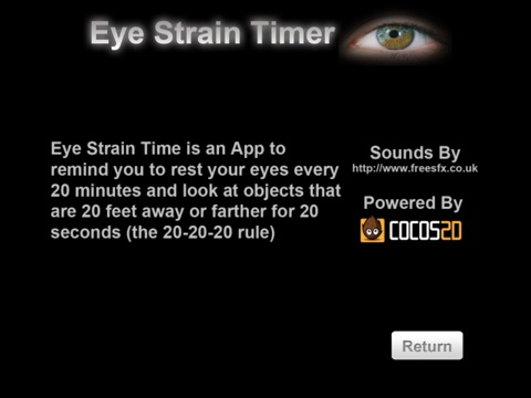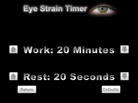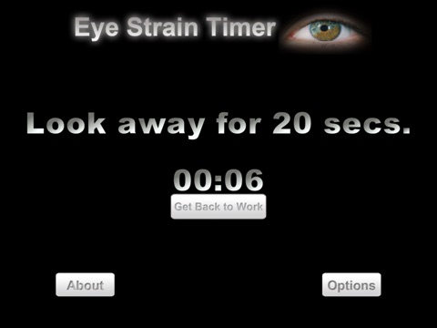 Save your eye from strain that happen due to prolonged sitting in front of computer monitor. Eye Strain break is a timer that will remind you to take that 20 seconds break every 20 minutes of work i.e. the 20-20-20 rule.