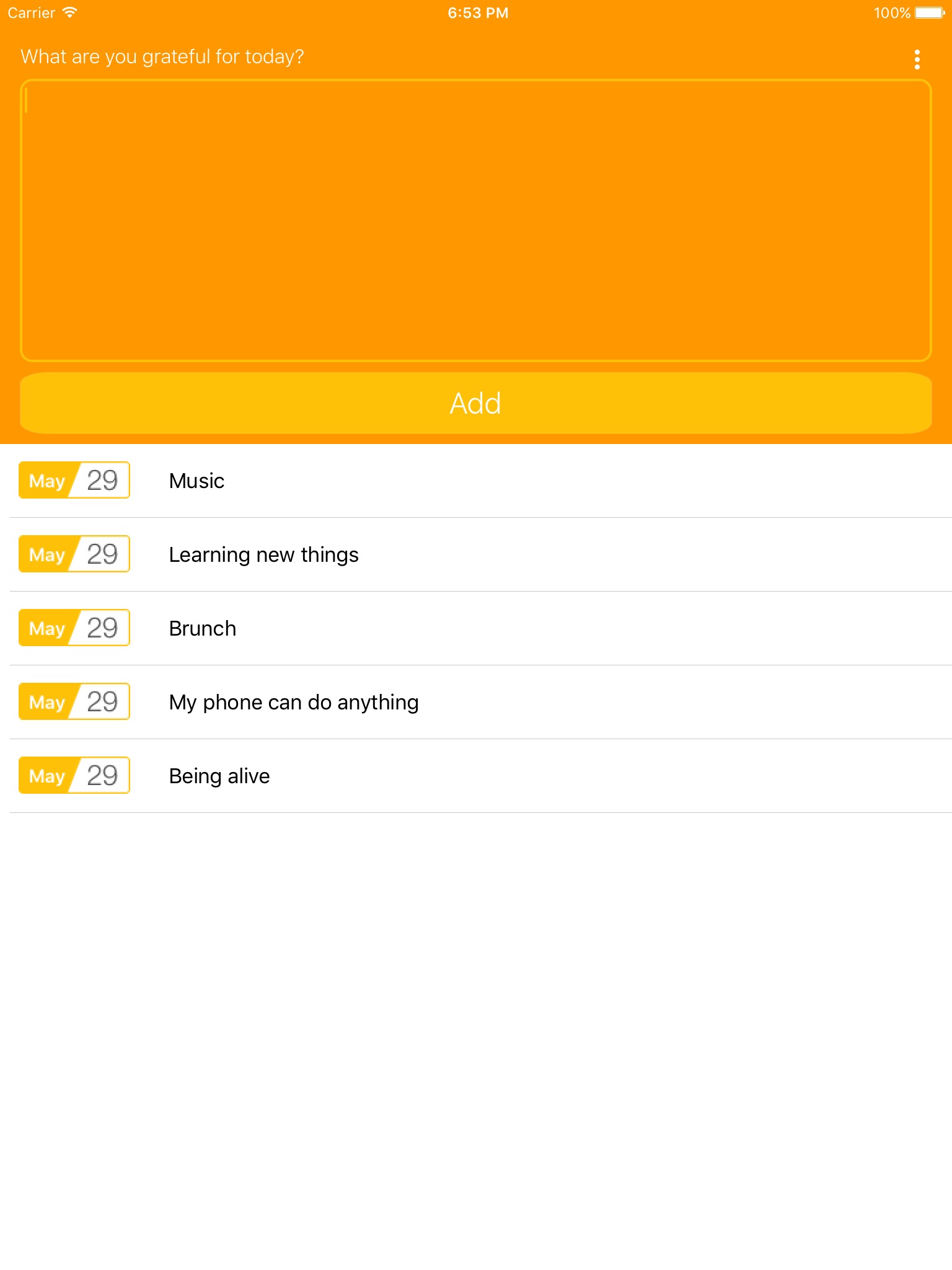This app is designed to be the easiest, simplest way to maintain a gratitude journal. Write a few things youre grateful for each day and then whenever you need a reminder of the good things in life, you can pull up this app and reflect on your blessings. You can even set a customizable notification to prompt you to take the time to be grateful.