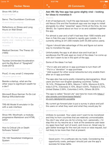 A stupid simple client for Hacker News. Browse the latest top posts in an infinite list, and if you dont like it, the whole app is open source! Performant even on the iPhone 4 so everyone can get their HN fix.