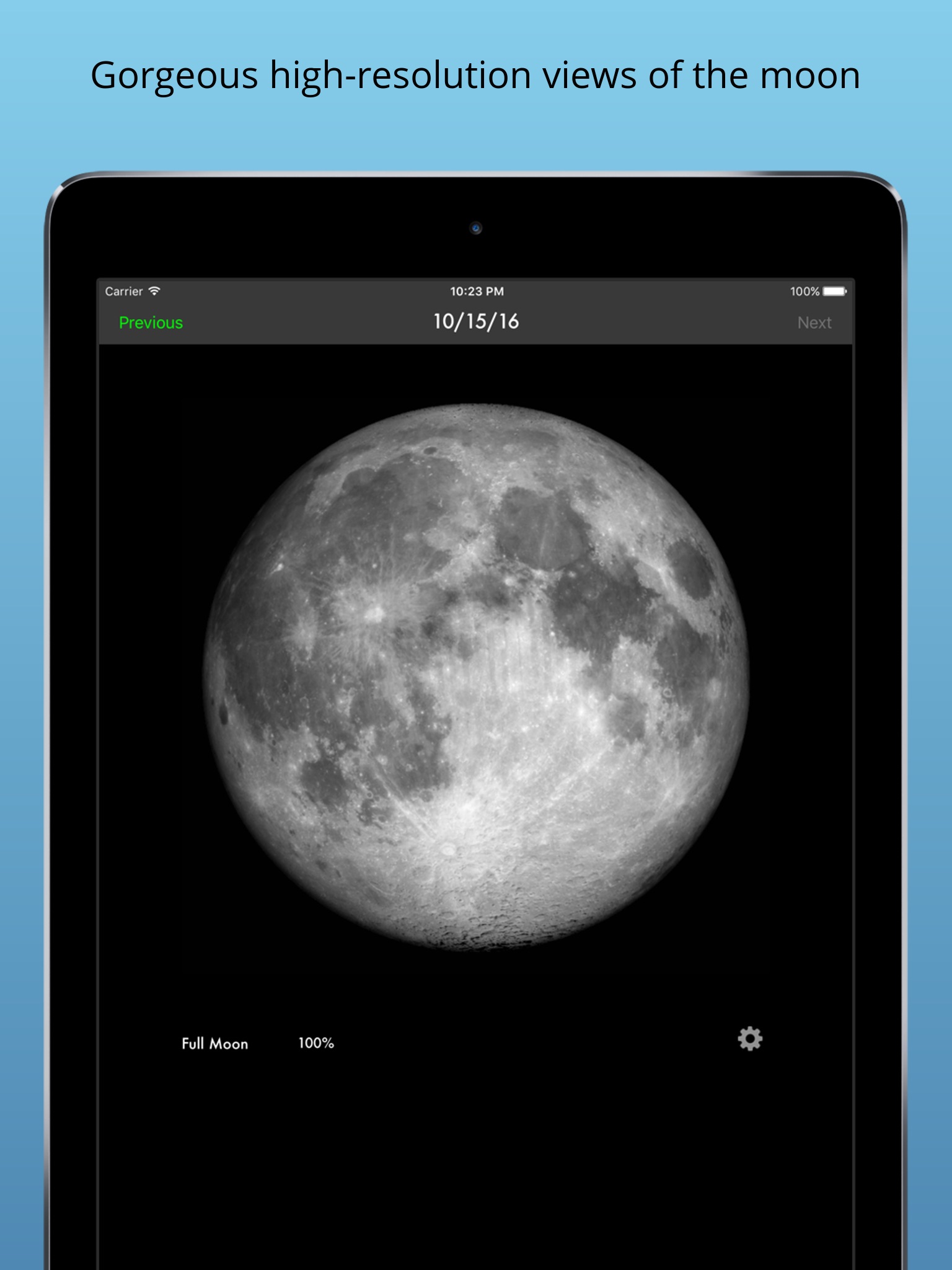 Tap the navigation buttons at the top or swipe to move between days. Use the calendar icon at the bottom to choose what date you want to see the moon view and illumination.