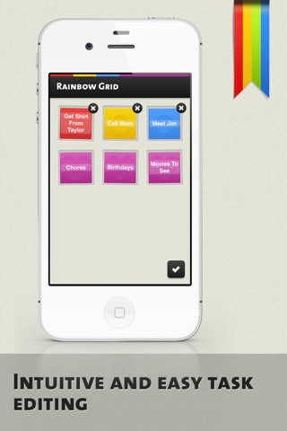 Simple.ToDO is a different approach to organize your life. Think about how easy and fun it is to move or group your apps on your iPhone screen. Rainbow Grid allows you to do just that with your tasks. With a colourful happy design, chores will never seem to be dull. You can use this app for almost anything worth writing down: notes, birthday reminders, daily tasks, one time reminders etc. Group and colour them how you want, really, the choice is yours!
