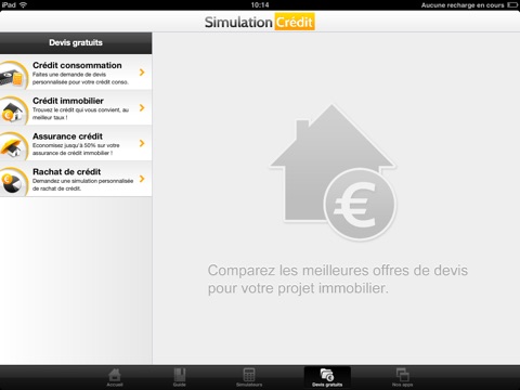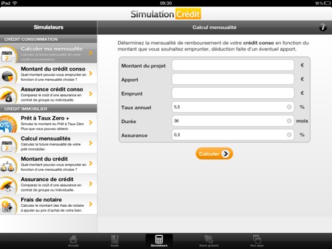 Avec lapplication "Simulation Crédit" vous bénéficiez de toutes les calculatrices indispensables à la réalisation de votre projet de crédit, quil sagisse dun crédit à la consommation, vacances, auto, moto, travaux, ou dun crédit immobilier.
