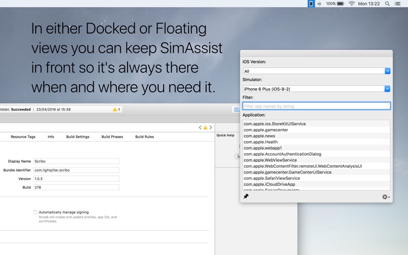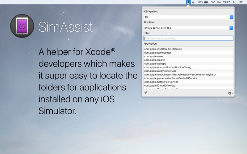 Simulator Assistant is a tool for Xcode ® developers who use the iOS simulators. When testing with the simulators it is often helpful to gain access to the file system for a specific app installed on a specific simulator version. You may wish to view files saved by your app, or add data files for testing, or perhaps copy files between simulator versions. Simulator Assistant makes locating these files quick and easy.