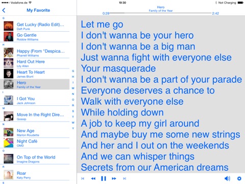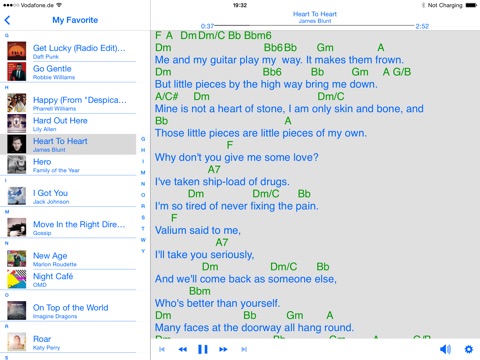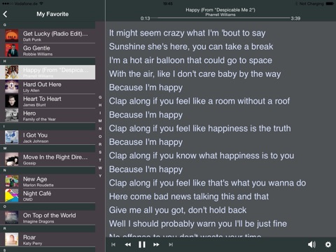 Sing a Song plays the songs of the Music App and shows the assigned lyrics. You can assign lyrics, PDFs, or ChordPros to each song. You could create your own lyrics, or you could search and copy them automatically from the web.