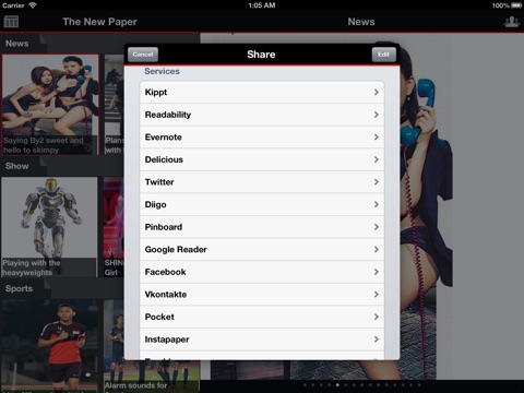 + One tap to share your article to Facebook, Twitter, Instapaper, Read It Later, GoogleReader, Pinboard, Tumblr, Delicious. Or you can copy, email, open the article in Safari.