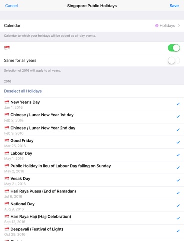 Insert the Singapore Public holidays into your iPhone calendar with one tap. The holidays will be added as all-day events so you can edit or delete them (they are not subscribed). You can also choose to add the country flag. Saves you a lot typing!