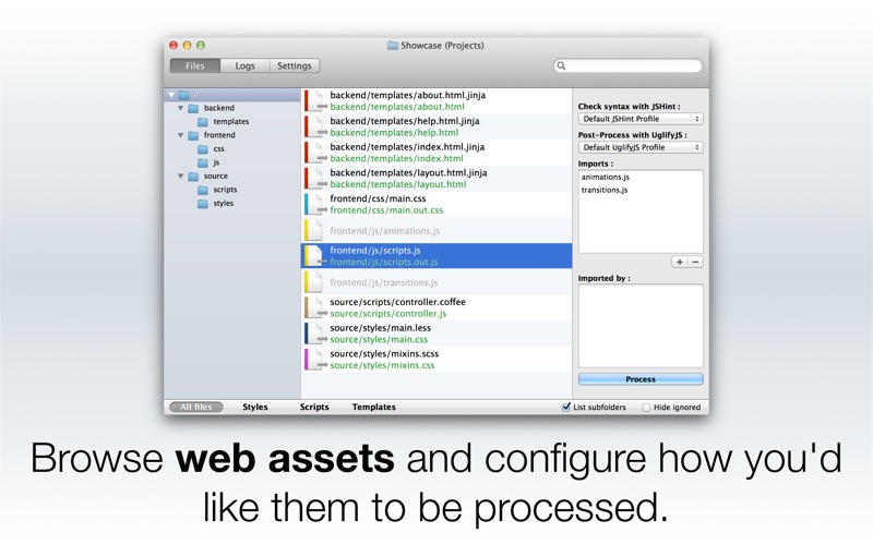Easily check syntax, minify or process all your web assets (stylesheets, scripts and templates) as you edit them with your favorite text editor!