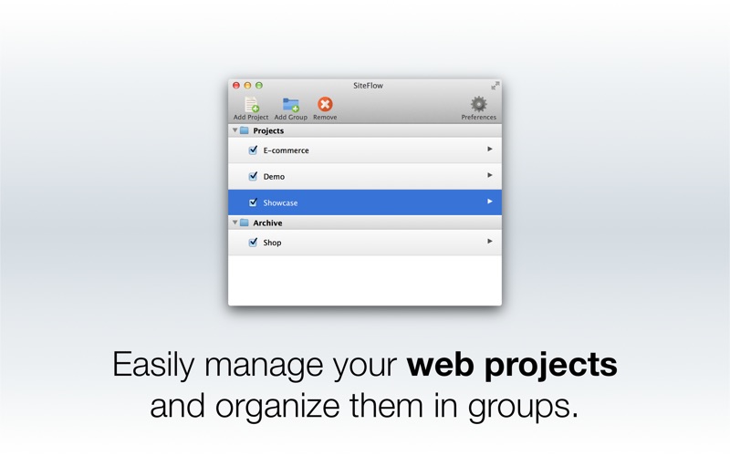 Whenever you change your styles, your scripts or any other files in your projects, SiteFlow can perform a live reload in your web browser to make your changes immediately visible, no more F5!